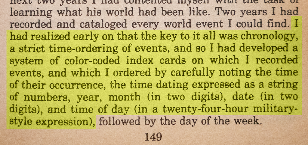 I learned this method not in a scientific context, but in a historical one. To recreate a timeline of historical events, each fact could be dated and easily sorted by date to try to suss out cause and effect. In the 1981 published novel The Chaneysvill Incident by David Bradley, the protagonist recreates events by keeping facts on index cards, each one numbered. This is also how telling the tale, the chapters, are named. (Also, he uses an additional element, the name of the day of the week, but this is superfluous and inconsistent for our purposes, and I forgot about it until I reopened the book 40 years after first reading it.)