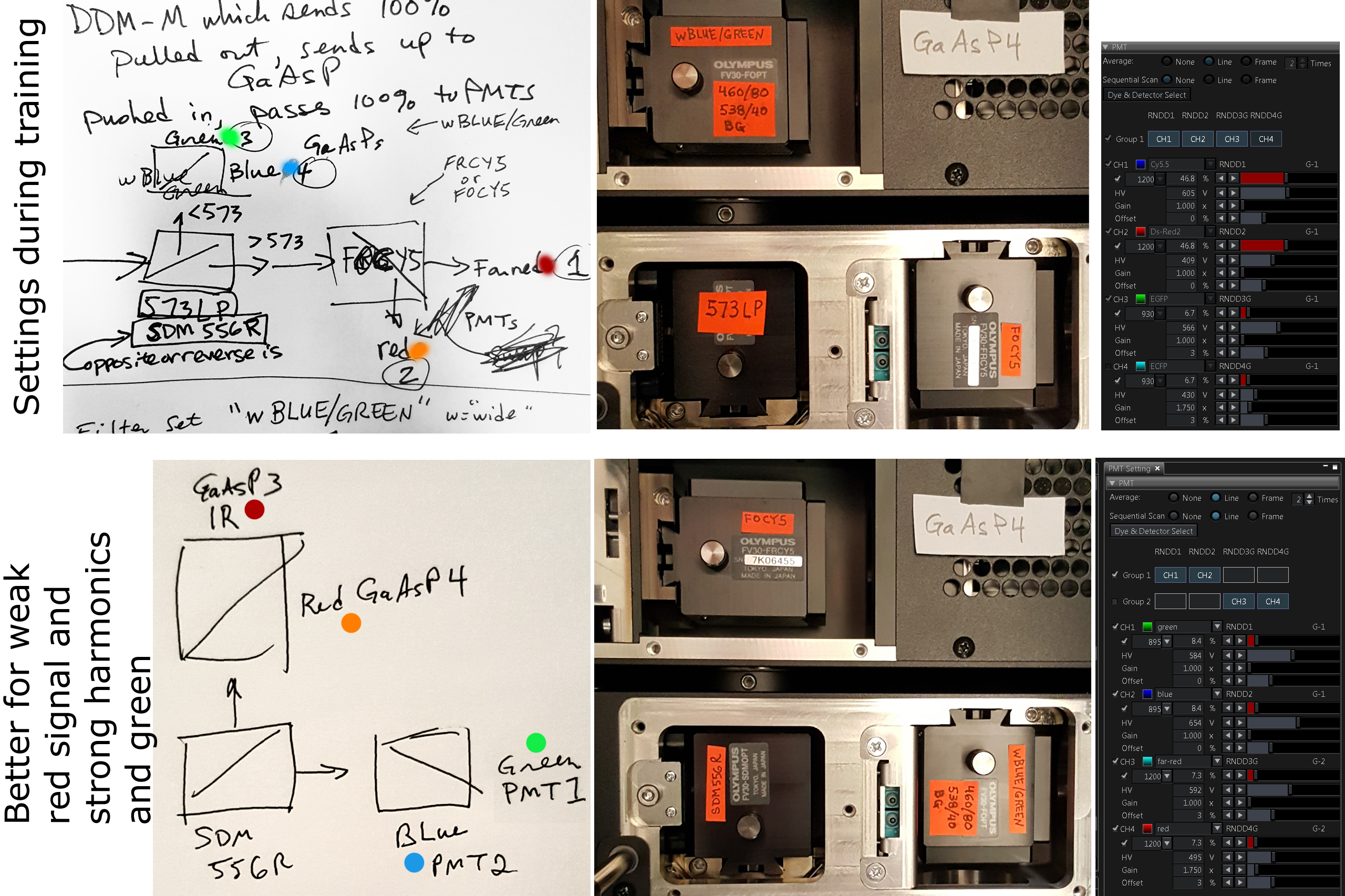 Splitters: 573LP and SDM556R are swapped when reversing blue/green and red/far-red to PMTs or GaAsP detectors.