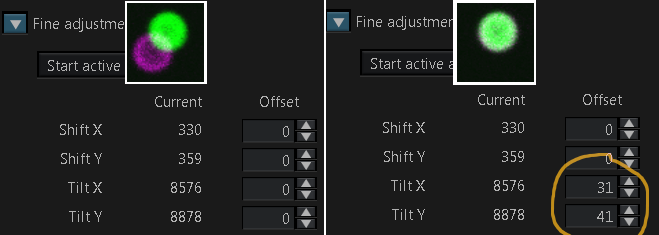 This is a single 4 um diameter multicolor bead and due to the laser paths at slight tilts, the excitation paths are not in register (not coaligned). To fix this, adjust the Tilt X and Tilt Y. You may want to go to a non-precious area and zoom in at 256 x 256 pixels and scan fast while adjusting. Adjust the Tilt, not the Shift, and this can be done with either or both of the lasers.