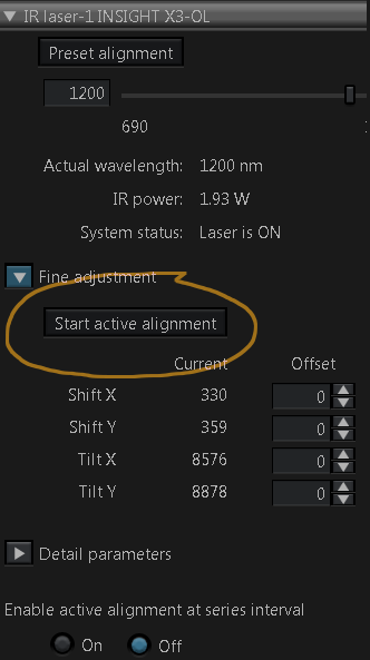 When you change the wavelength of a laser, wait for it to tune and then click the "Start active alignment" button in the fine adjustment pull down menu.