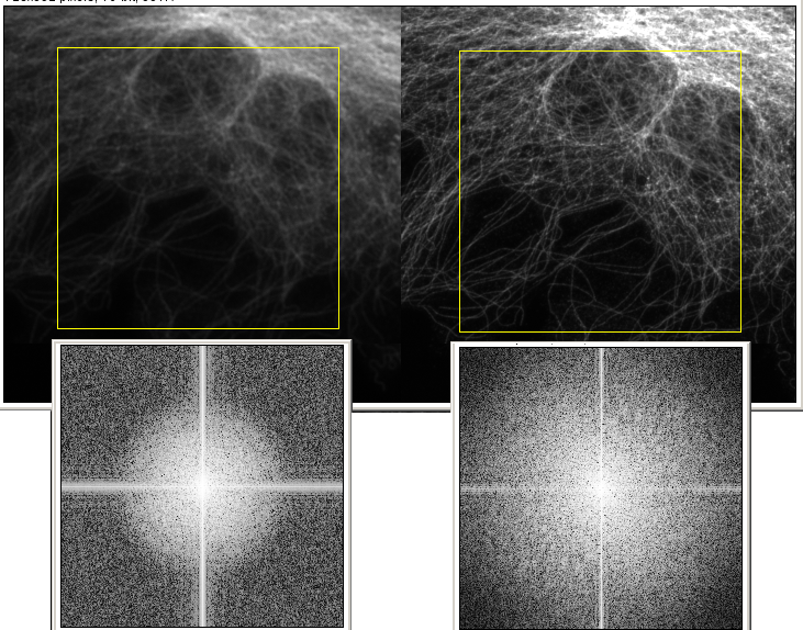 Another way to look at the spatial resolution is to look at the distribution of frequencies within the images. The image on the left shows frequencies concentrated in the center; these are more low frequencies. The Image on the right shows a broader distribution with frequencies spread to the edge of the power spectrum; these are higher frequencies. Seeing smaller things is seeing higher frequency information. This is finer spatial resolution.