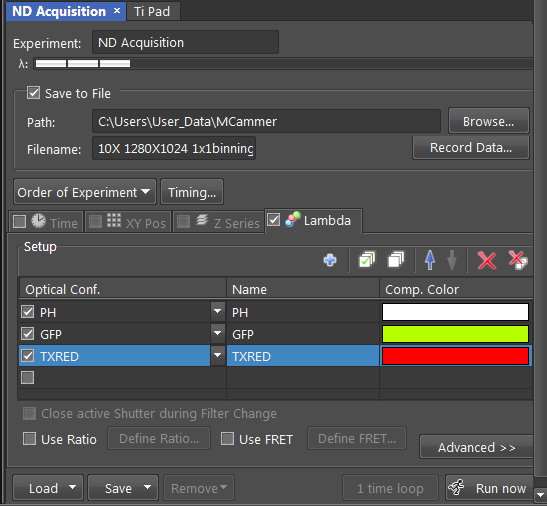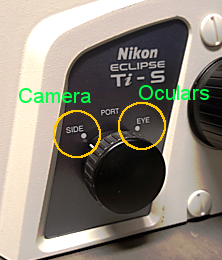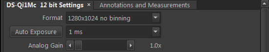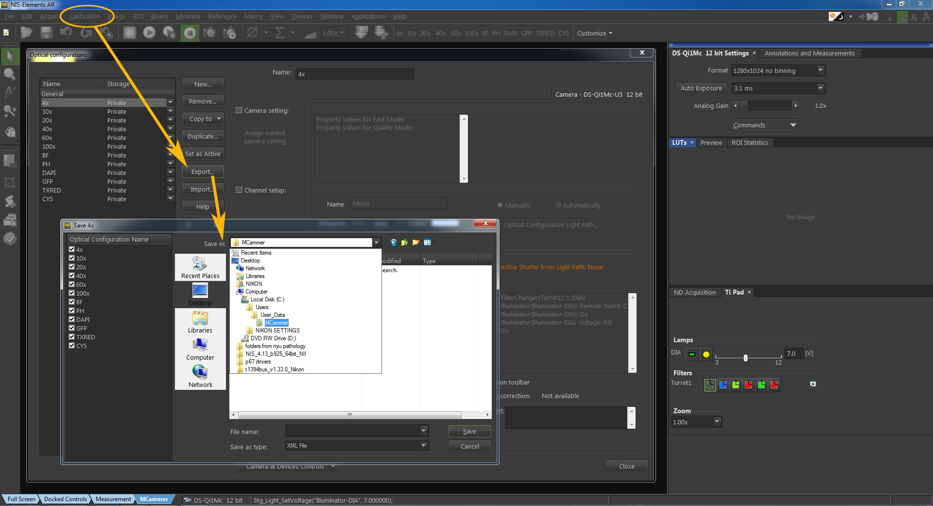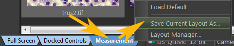 Nikon DS-Qi1 camera installed on 1 April 2015. Recommend using at full 1280 x 1024 with binning 1 X 1. New spatial scale information here. Other changes: When you turn on the computer, it will log into a common account. When you run NIS Elements, the first thing you should do (if you have used the system before) is load your favorite settings. There are two parts to this. You may customize the look of the program screen. In the lower left there are tabs.