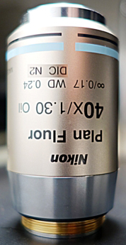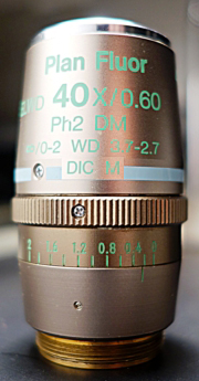 The 40X lens with the numbers printed in green is designed for tissue culture plastic. It will work with coverslips, but has a ring on it that needs to be adjusted. It is an air objective. DO NOT put oil on it!