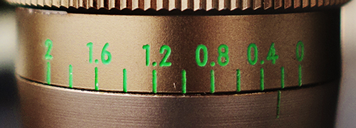 As pictured, the adjustment is a little bit too far open for a #1.5 coverslip, but close enough. If you were imaging through a plastic tissue culture dish, the setting would likely be between 1 and 2. (The units are mm.)