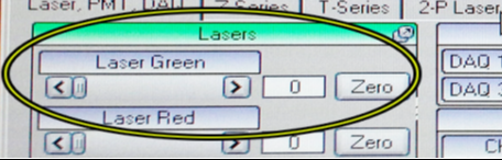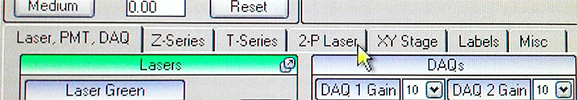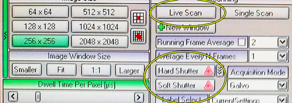 Then go back to the Laser tab on the far left. Use the Hard Shutter to open the shutter between the Pockels cell(s) and the objective lens and also use Live Scan.