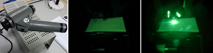 The left shows the IR viewer. Center, looking through the eyepiece of the IR viewer at the phosphor screen, the laser shutters are closed. On the right they are open.