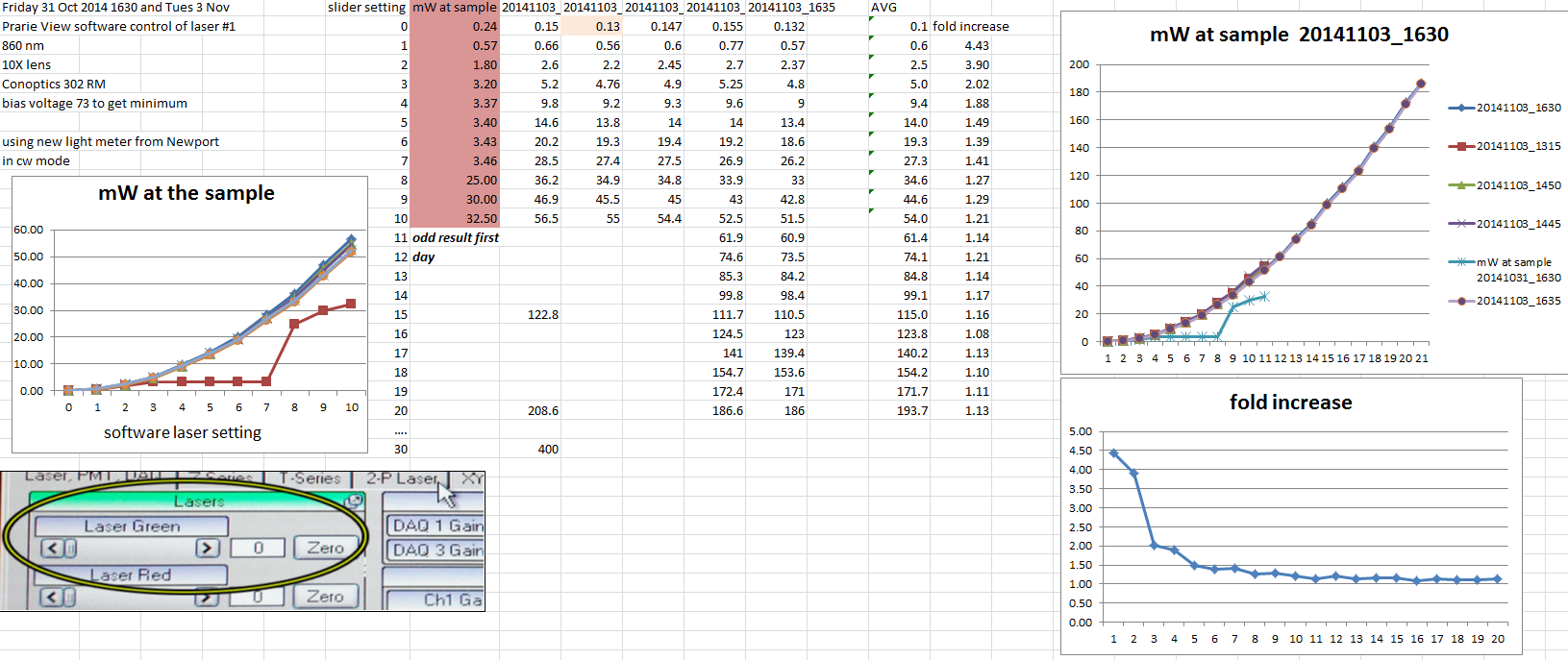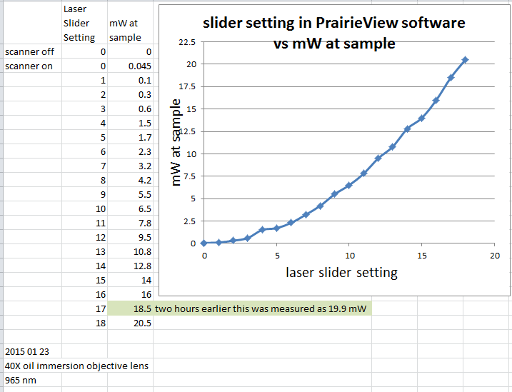 When the laser and Pockels cells have stabilized, the response should be something like this: [Excel] [PNG]. These readings were taken in Jan 2015 after the laser was attenuated at the source. Before the laser was attenuated, these readings from early Nov 2014 [Excel] [PNG] show the laser power in jumps too gross for protecting biology. The laser may be attenuated more if you need it.