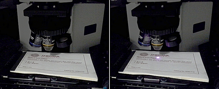 Be safe: do not put a highly reflective object (metal, glass, shiny plastic) under the microscope objective. You cannot see the IR (infra red) light but it may be there! White paper is diffuse enough.