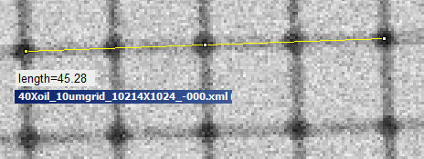 There is a tab in the software to set the microscope objective. When the lens is set for 40X and you are using the 40X oil lens, the scale is a little off in the .cfg file saved with the image. This example is a 1024 X 1024 transmitted light detector recording of a 10 um x 10 um grid from Thorlabs.