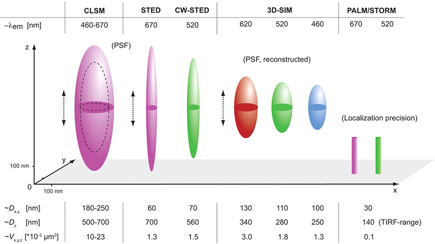 Figure 3 from the same paper has become a standard illustration of spatial resolution in different microscopy techniques. Although newer techniques since 2010 aren't listed such as commercial AiryScan and iSIM and non-commercial lattice light sheet.