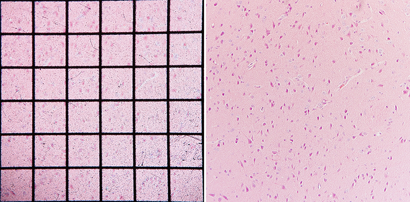 Images below show H & E section through grid (left) and without grid (right). As per the image above, each box is 100 X 100 um in the tissue slice. The transparency is not really clean. For good imaging, should be replaced with professional printing on glass or polycarbonate disk.