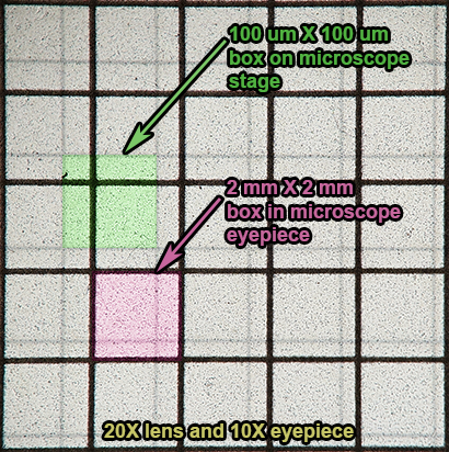 When you use the 20X lens, each box represents 100 um X 100 um in the sample.