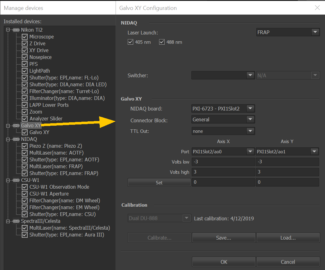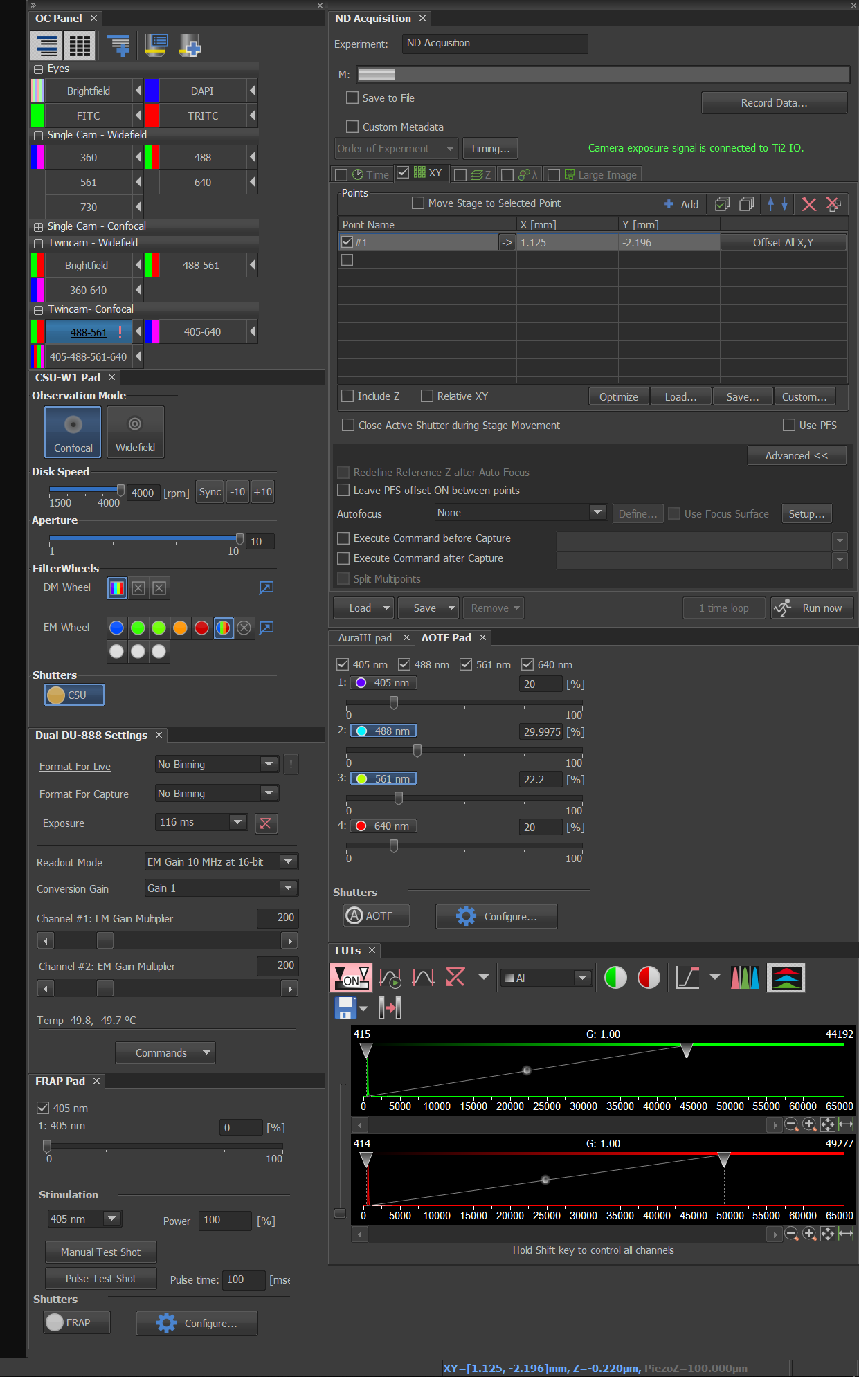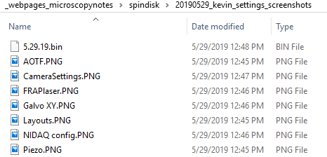 The following table of laser powers was taken with the calibrated AOTF settings with Newport power meter 1928-C wand 818-ST SN 5110 taped to the 10X lens.