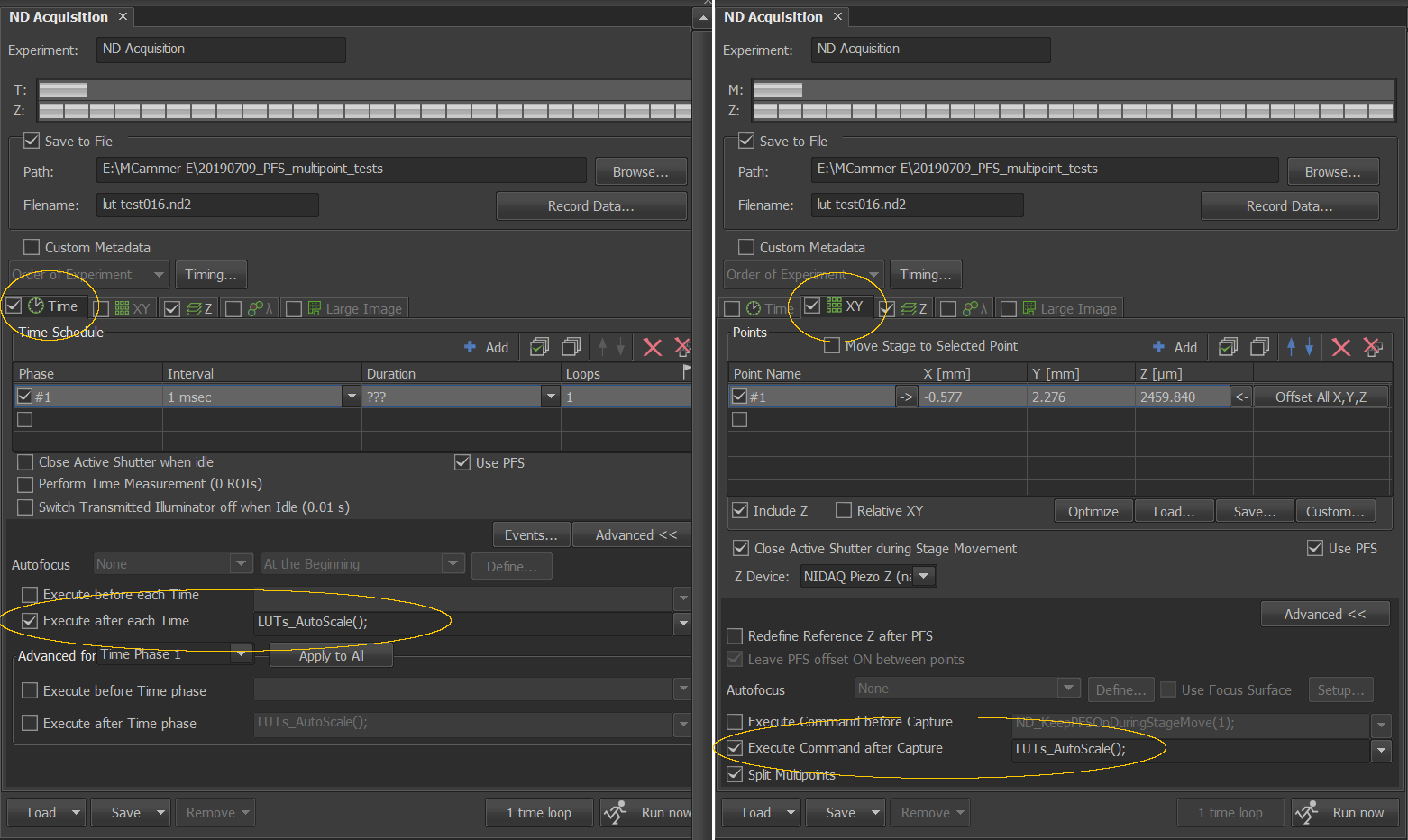 If you are doing a Z series, you also need to set a single Time loop or a single XY position because the following commands do not seem to work in the Z series advanced settings.