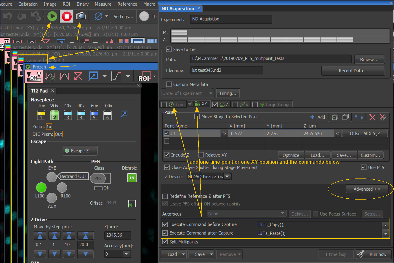 Add the commands “LUTs_Copy()” and “LUTs_Paste()” to XY or Time ND Acquisition as pictured.