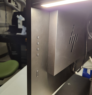 Buttons on rear of display monitor. Vertical rectangle button at bottom is power. Turning this on should connect the monitor to the computer and automatically be recognized as a second screen. Four smaller square buttons are used for maneuvering through the sesstings menus. |