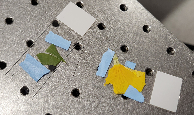 Test samples used here were pieces of plants. A leaf from a plant in the common area and a petal from a flower out in the rotary. Excitation was at approximately 550 nm and the detector was set with emission spectra up to approx 700 nm to collect most emitted photons of any energy level.