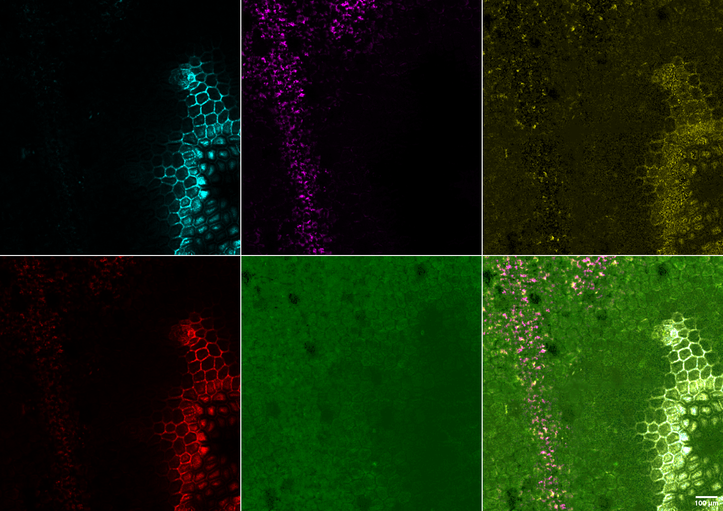 Therefore, we do not know the lifetime bins for the next image. Each single color panel is a different lifetime. The cyan and red look very similar, but they are supposed to be differnt lifetimes. 10X N.A. 0.40 lens.