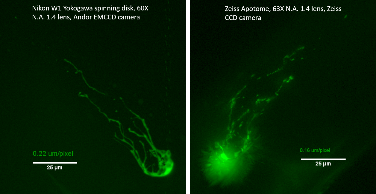 Nikon implementation of Yokogawa spinning disk confocal vs. Zeiss Apotome (strain JK2869 imaged 2020-08-26):
