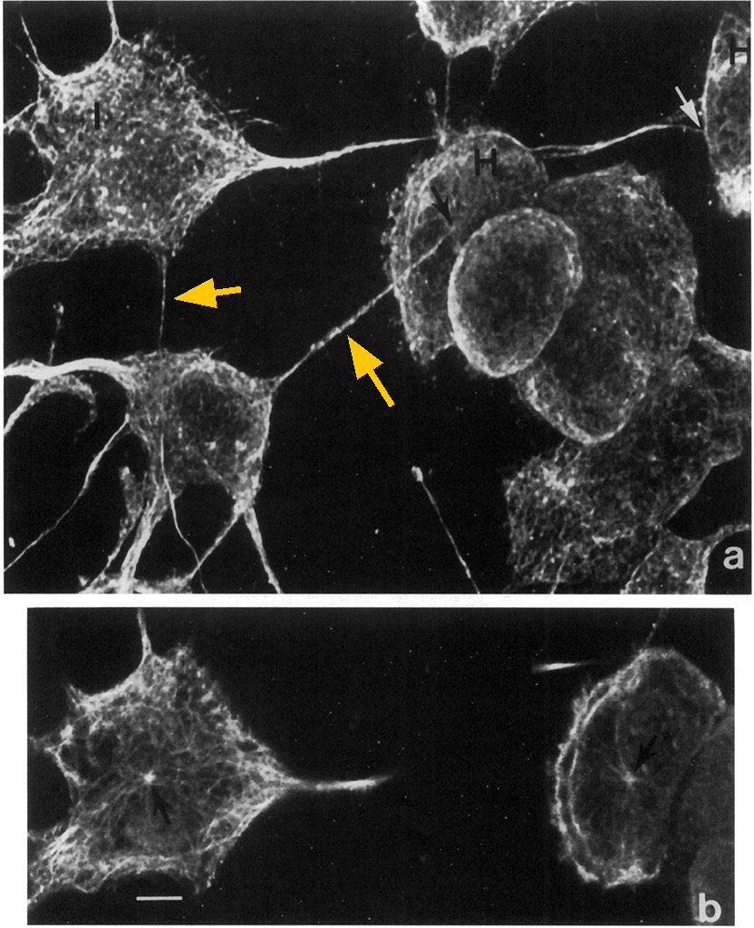 The two pictures below from Am J Pathol. 1995 Jun;146(6):1508-20. Rojkind M1, Novikoff PM, Greenwel P, Rubin J, Rojas-Valencia L, de Carvalho AC, Stockert R, Spray D, Hertzberg EL, Wolkoff AW. Characterization and functional studies on rat liver fat-storing cell line and freshly isolated hepatocyte coculture system. PMID: 7778689 PMCID: PMC1870907 are confocal images that contain what appear to be tunneling nanotubes. "FSCs [fat storing cells] send out long projections and make contact with hepatocytes that are some distance away." But it may have been too ambitious to say that the centriole had MTs radiating out the the point of contact. Also, in retrospect, I think we may be seeing background fluorescence as well as tubulin staining, so not convinced the projections are really lighting up due to MTs.