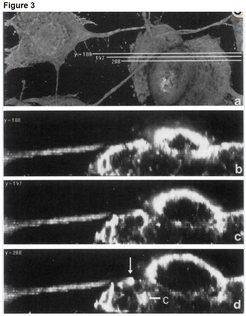 Twenty-five years later, at an ASCB/EMBO conference (Philadelphia 2017), I remembered these images and dug them up. Two years later I am posting them because they certainly appear to be TNTs. The orange arrows are added to point to likely TNTs.