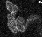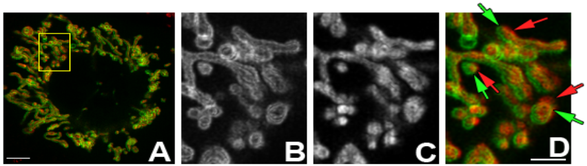 | Requirement for dual cameras for simultaneous two channel imaging of live cells. Two fluorescent channels out of register with serial exposures as shown in this deconvolved single optical section of live COS cells expressing HK1-GFP and loaded with mitotracker dye. Protein localization on outer mitochondria membrane surface (B, green) clearly resolved from interior (C, red). Arrows point to mis-registered pixels due to movement between exposures. (A) Field at 100X, scale bar 5um. (B) HK1-GFP; (C) Mitotracker; (D) Merged B and C, scale bar for B, C and D, 2um. |