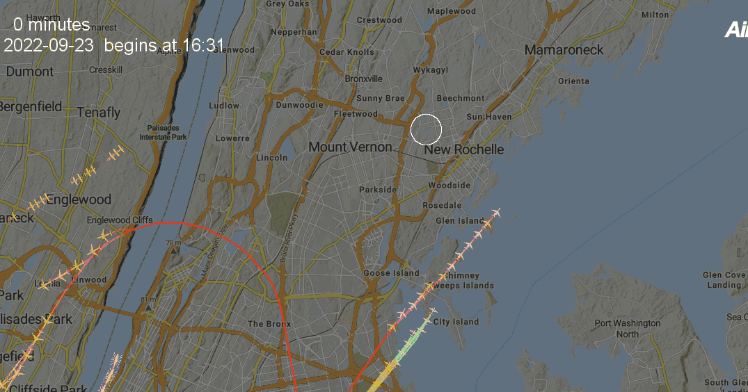 Most planes skirt the neighborhood, but 11:23 PM 22 Sep 2022 a plane appears to go directly over the apartment buildings on the Pelham/New Rochelle border on the NW side of the lake.