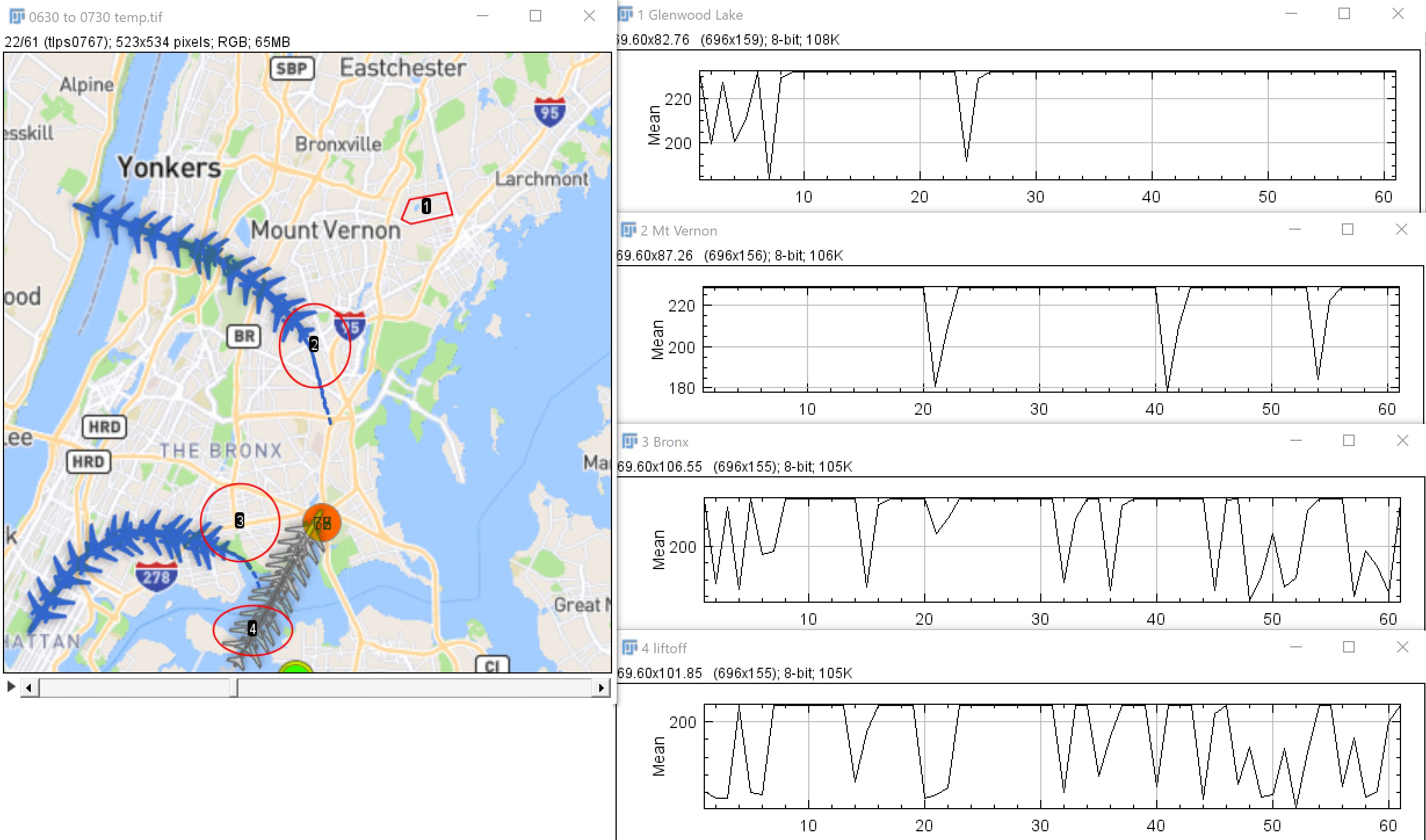 For our method of counting, any variation below baseline intensity (the map is always represented with brighter pixels than flights) will be counted as aircraft in the region. Therefore, this may not be a completely accurate count of number of planes. However, when normalized to the total number of frames in each period being measured, this will provide a direct comparisons with other locations being measured. For instance, no planes would be zero. Planes all the time would be 1.
