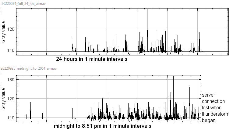 The kymogram on the bottom shows midnight to 8:51 pm on Sept 25 (our server connection went down when a thunderstorm began).