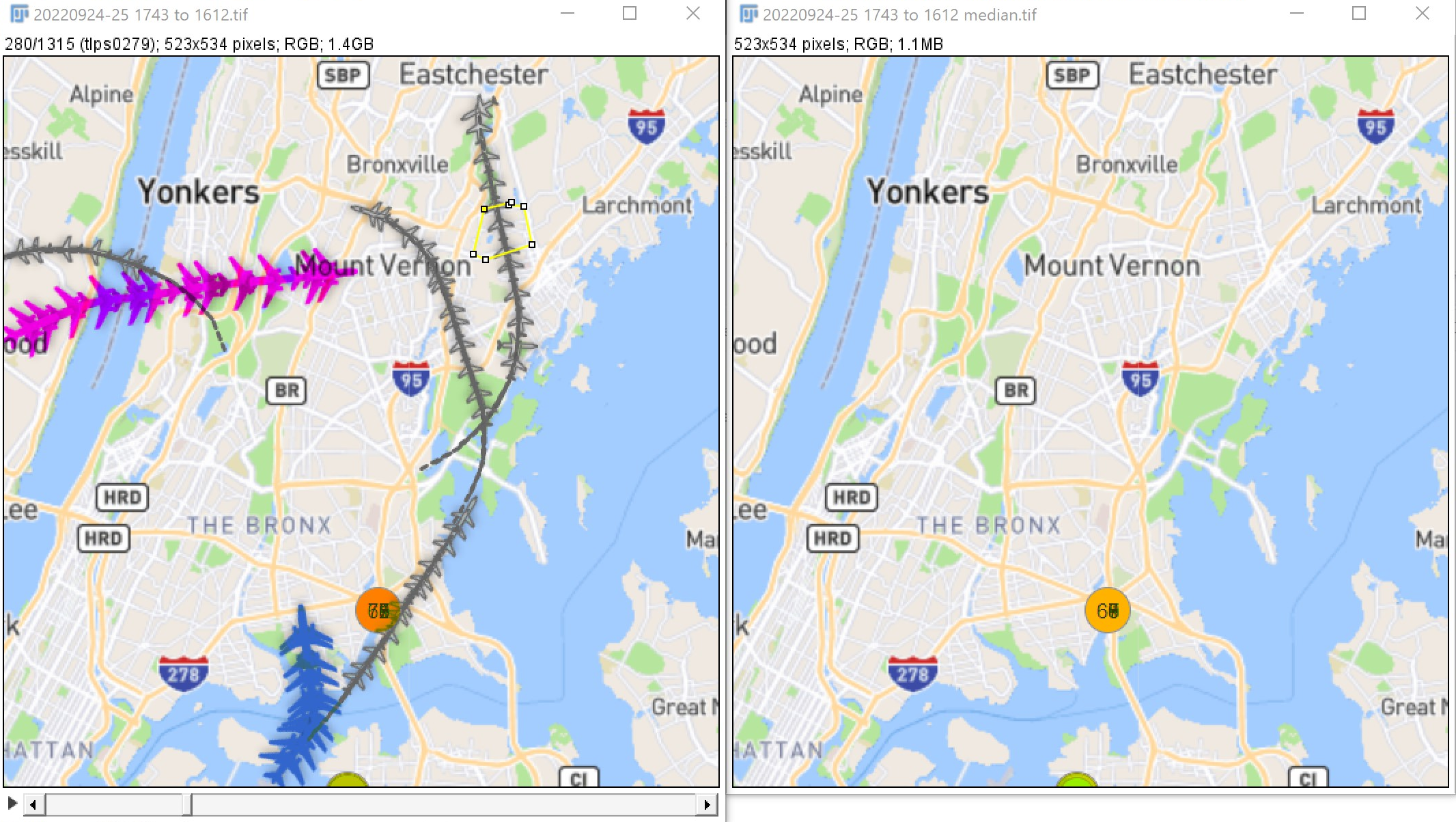 A flight will be counted based on a change of intensity in the image due to an aircraft being drawn in the region of the map. To measure this change, the baseline value must be known. This is defined by either choosing a timepoint where there are no aircraft visible, by producing a composite copy/paste map of no aircraft visible, or by creating a median projection through time based on the expectation that at no point will any location have aircraft present moe than 49% of the time.