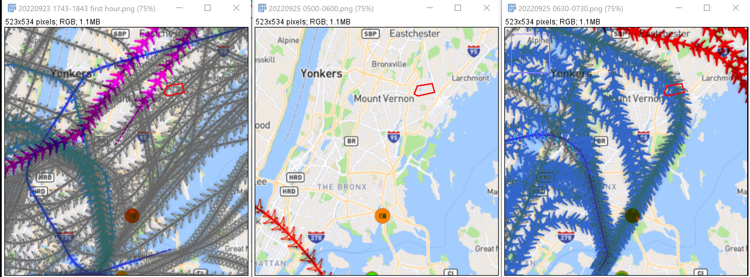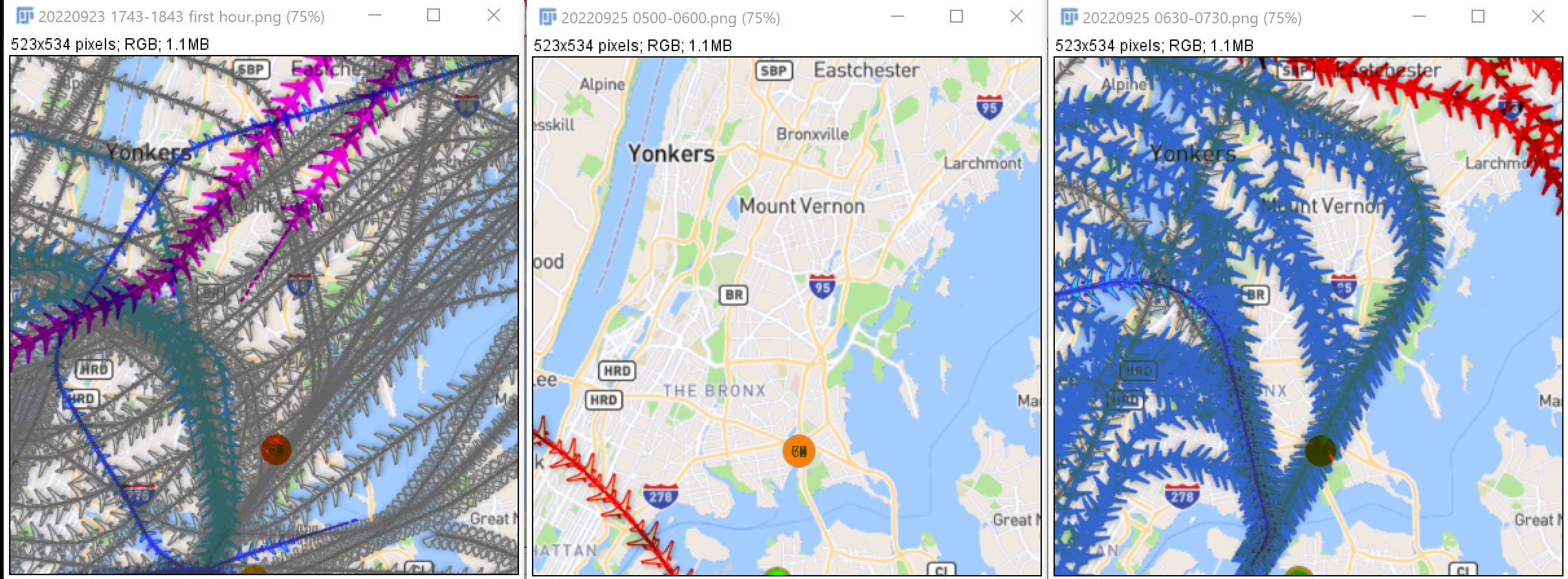 At the left is the first hour of recording, late afternoon from 5:43 pm to 6:42 pm on Friday, September 23, 2022. The solid magenta are commercial flights departing from EWR and the other flights are not airport coded (gray). However, the paths that begin at the bottom and cut directly across the red dot and to the left of the red dot headed north are departures from LGA.