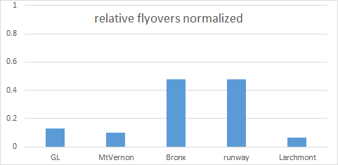 Reasonable conclusions: It appears Mt. Vernon and Glenwood Lake get equal direct flyovers. The Bronx gets far more than both northern locations combined. Obviously, the end of the LGA runway gets the most as all flights originated there.