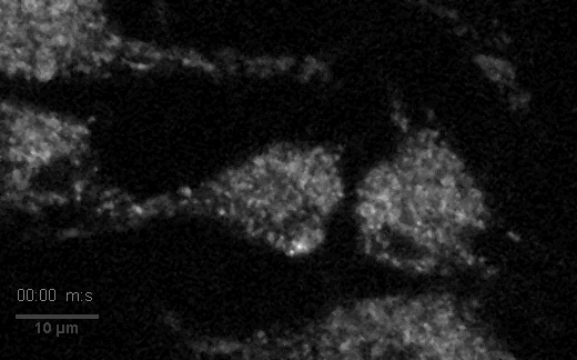 Live raw LR5 macrophage cell line was loaded with an itereation of a new dye being developed and was imaged with Zeiss 880 confocal in spectral mode with excitation at 405 and 561 nm and collection across the spectrum with 8.9 nm wide bins. Channels were then combined using avg projection method for each timepoint.