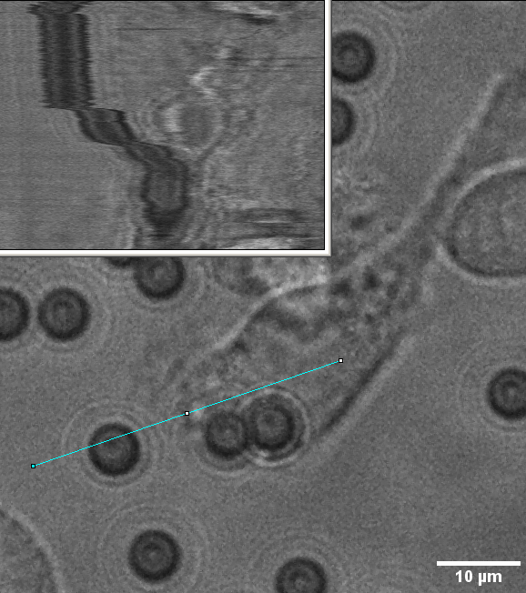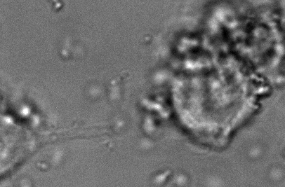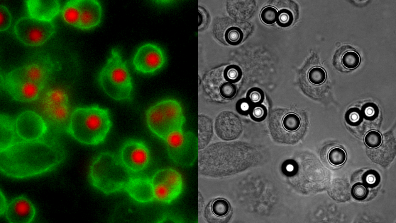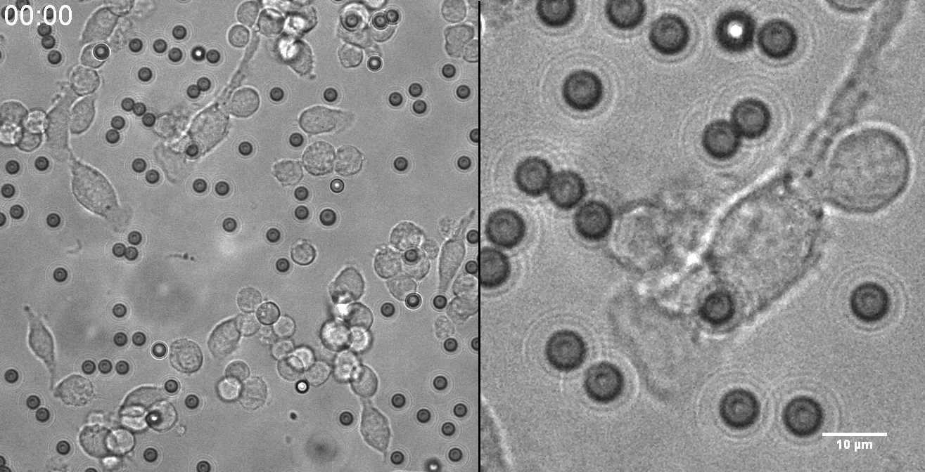 Fixed cells with internalized beads prepared by Dianne Cox. Beads are 5um in diameter.