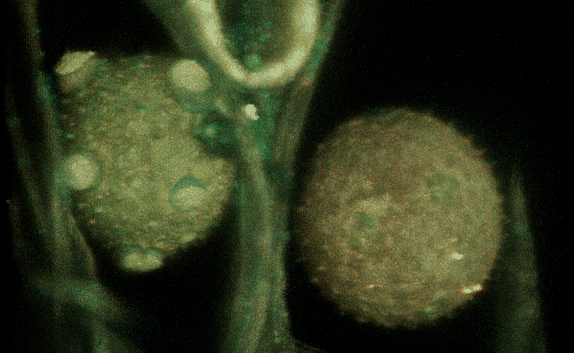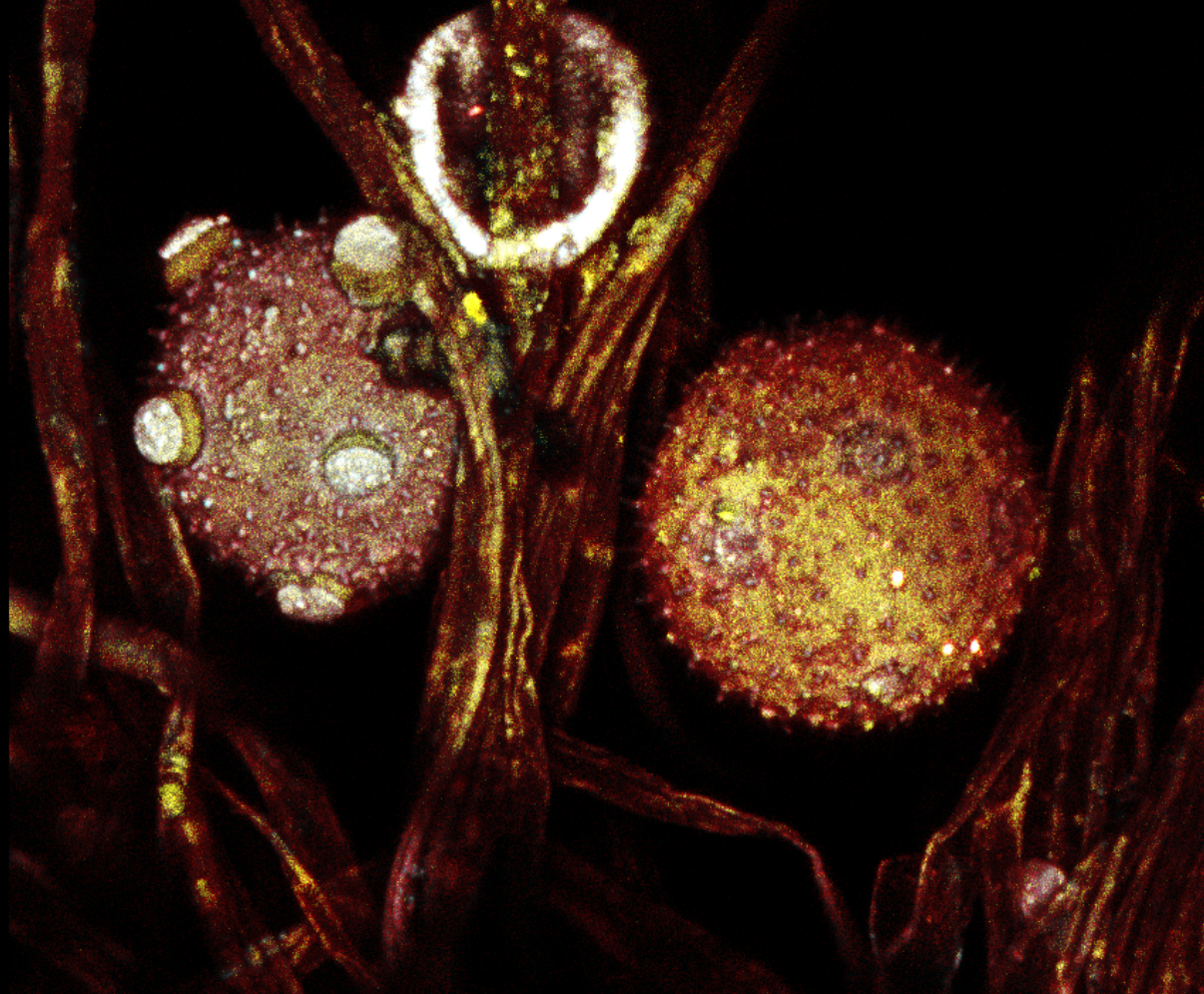 Pumpkin pollen imaged on Zeiss 880 by autfluorescence with excitation at a few different wavelengths.