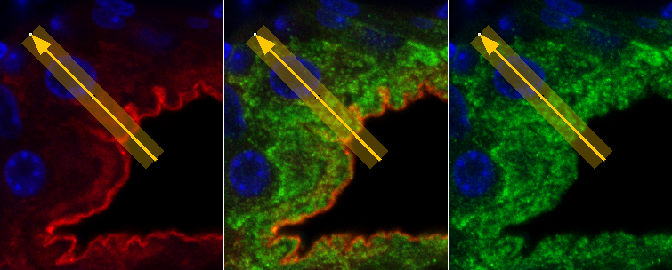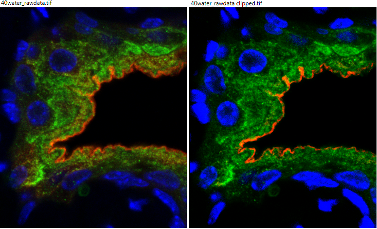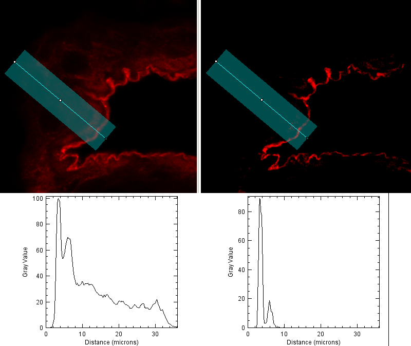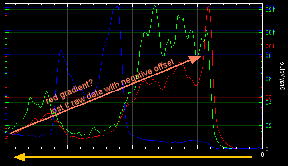 Excluding values from the raw data (right) by a negative offset excludes information. Described better in the next set of pictures showing intensity profile plots of each channel along the orange arrows.