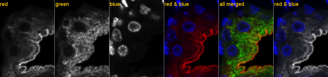 Displaying data is a different issue. Here are the raw data displayed as grayscale with three merge options. I argue for grayscale because it is higher contrast and avoids problems with colorblind people. There is a lot of resistance to doing this and it does not change the science, but I like to recommend it.