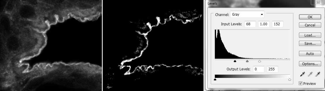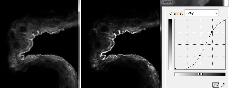 "Adjustments of 'Curves' or 'Levels' in Photoshop alter the tonal range and color balance of an image by adjusting the brightness of only those pixels at particular intensities and colors. Such nonlinear changes are sometimes required to reveal important features of an image; however, the fact that they have been used should be disclosed in the figure legend."