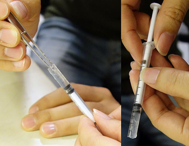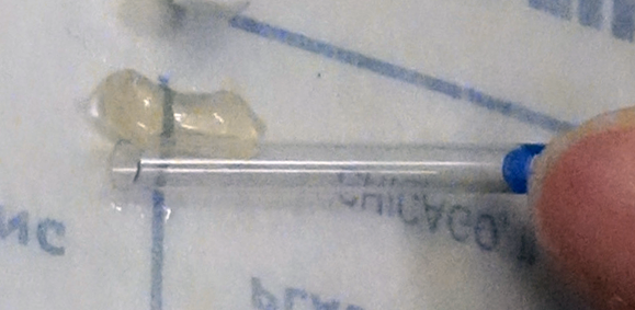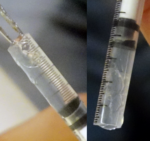 A live zebrafish is embedded in agarose inside a small bore pipette. After the agarose hardens, it is pushed out into the sample chamber of the microscope (teflon tip of plunger at far left). Imaging cannot be performed through the glass.